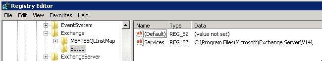 - Modify the value in "Services" and set the path to your Exchange directory, usually C:\Program Files\Microsoft\Exchange Server\V14