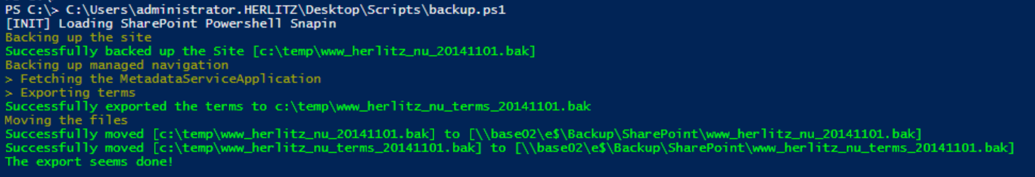 $site = "http://sp2013dev" $localPath = "c:\temp\" $remotePath = "" #set if you want to move the backups when done $backupName = "sp2013" $serviceName = "Managed Metadata Service"