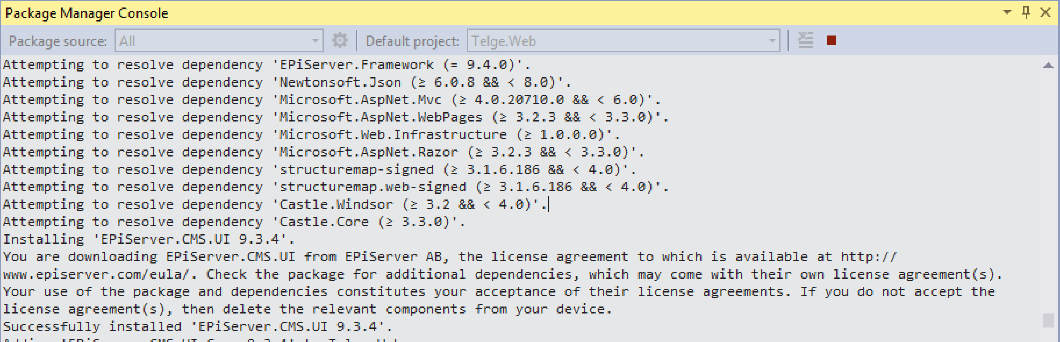 Open your project in Visual Studio and open the Nuget Package Manager Console. This isn’t any magic console, it’s PowerShell with a Nuget add-in.