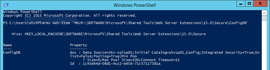 Get-Item 'HKLM:\SOFTWARE\Microsoft\Shared Tools\Web Server Extensions\15.0\Secure\ConfigDB'
