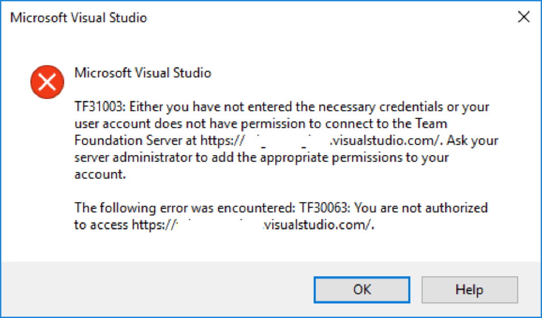 "TF31003: Either you have not entered the necessary credentials or your user account does not have permission to connect to the Team Foundation Server at https://... Ask your server administrator to add the appropriate permissions to your account."
