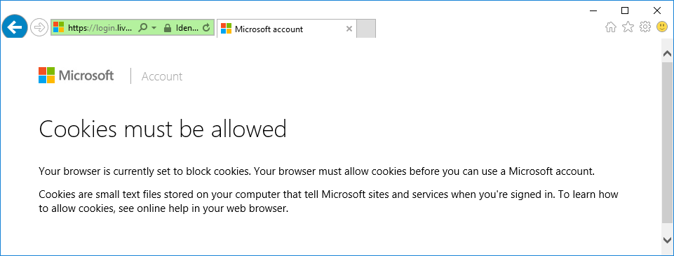 Your browser is currently set to block cookies. Your browser must allow cookies before you can use a Microsoft account.