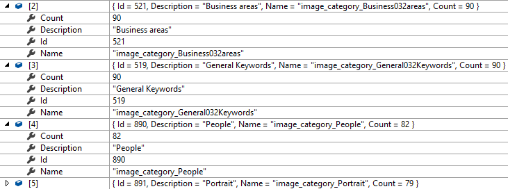 // Anonymous object with category Id, Description, Name and Count