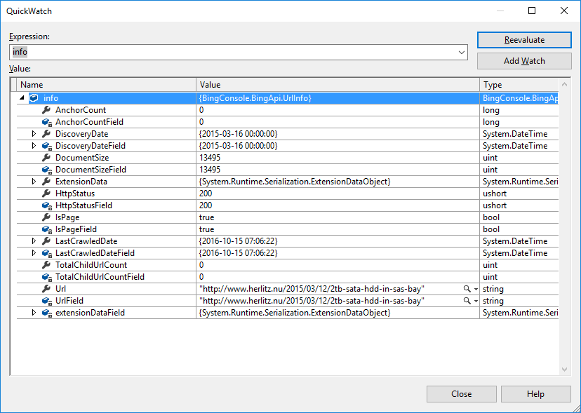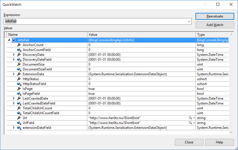 var bingApi = new WebmasterApiClient(); var siteUrl = "http://www.herlitz.nu/"; // This should be ok var info = bingApi.GetUrlInfo( siteUrl, string.Concat(siteUrl, "2015/03/12/2tb-sata-hdd-in-sas-bay") ); // This should fail var infoFail = bingApi.GetUrlInfo( siteUrl, string.Concat(siteUrl, "IDontExist") );