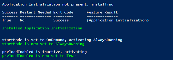 Write-Host "preloadEnabled is now set to $((Get-ItemProperty "IIS:\Sites\$siteName" -Name applicationDefaults.preloadEnabled).Value)" -ForegroundColor Green