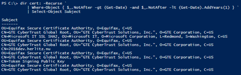 dir cert: -Recurse | Where-Object { $_.NotAfter -gt (Get-Date) -and $_.NotAfter -lt (Get-Date).AddYears(1) }