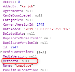 The issue in this implementation is that the serialized ImageVault.Common.Data.Media class doesn't contain any metadata when added to the editor.