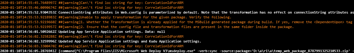 ##[warning]Unable to apply transformation for the given package. Verify the following. ##[warning]1. Whether the Transformation is already applied for the MSBuild generated package during build. If yes, remove thetag for each config in the csproj file and rebuild. ##[warning]2. Ensure that the config file and transformation files are present in the same folder inside the package.