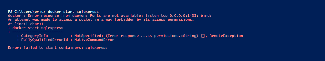 An attempt was made to access a socket in a way forbidden by its access permissions. At line:1 char:1 + docker start sqlexpress + ~~~~~~~~~~~~~~~~~~~~~~~ + CategoryInfo : NotSpecified: (Error response ...ss permissions.:String) [], RemoteException + FullyQualifiedErrorId : NativeCommandError Error: failed to start containers: sqlexpress