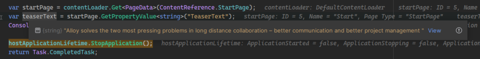 var startPage = contentLoader.Get(ContentReference.StartPage); var teaserText = startPage.GetPropertyValue ("TeaserText");