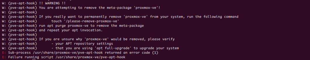 W: (pve-apt-hook) !! WARNING !! W: (pve-apt-hook) You are attempting to remove the meta-package 'proxmox-ve'! W: (pve-apt-hook) W: (pve-apt-hook) If you really want to permanently remove 'proxmox-ve' from your system, run the following command W: (pve-apt-hook) touch '/please-remove-proxmox-ve' W: (pve-apt-hook) run apt purge proxmox-ve to remove the meta-package W: (pve-apt-hook) and repeat your apt invocation. W: (pve-apt-hook) W: (pve-apt-hook) If you are unsure why 'proxmox-ve' would be removed, please verify W: (pve-apt-hook) - your APT repository settings W: (pve-apt-hook) - that you are using 'apt full-upgrade' to upgrade your system